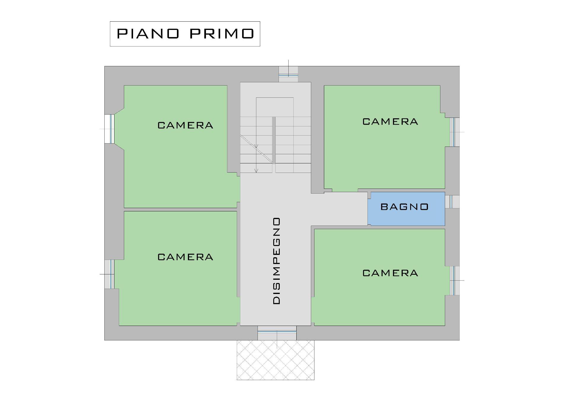 Primo piano: disimpegno, quattro camere e bagno.