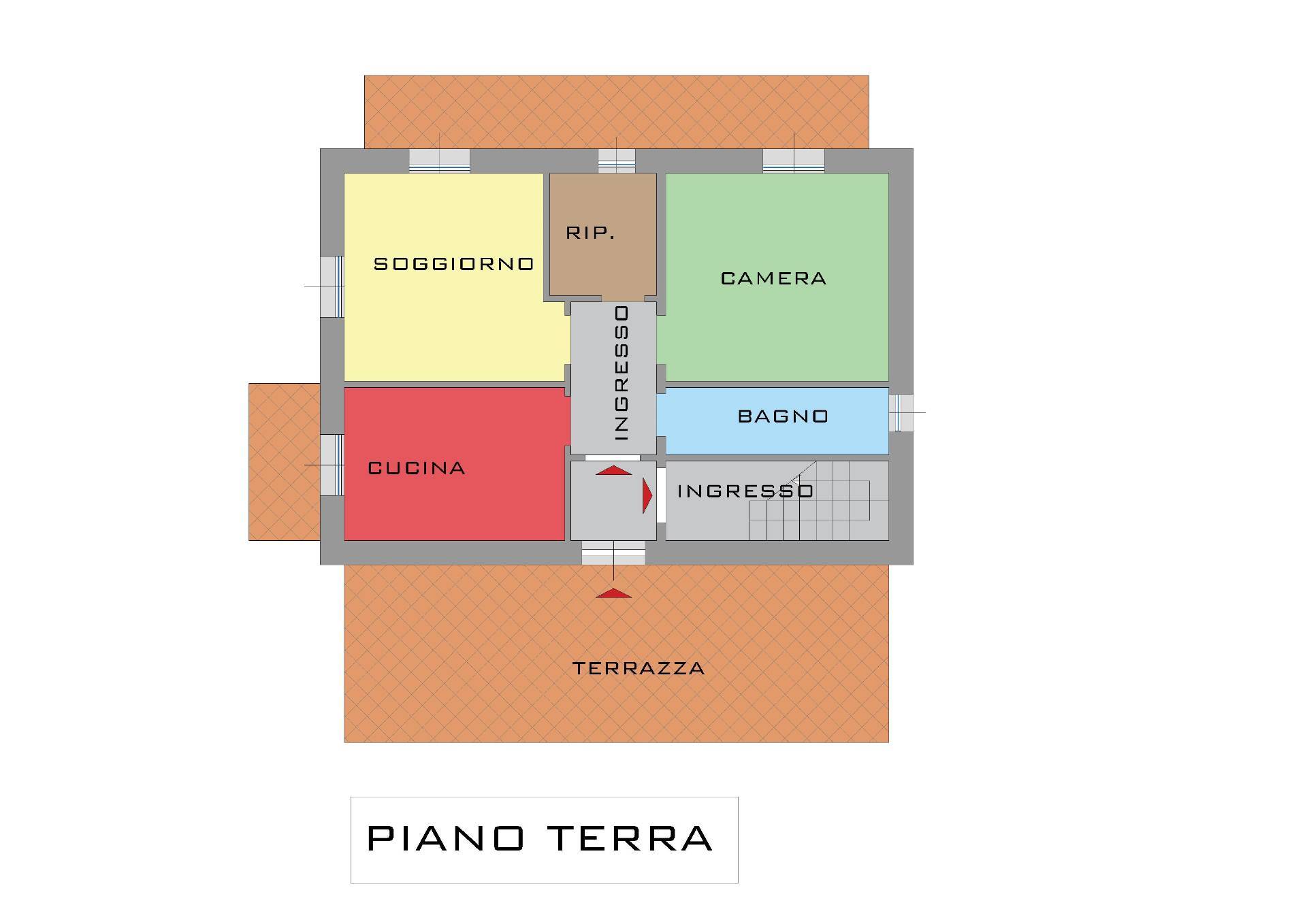 Piano terra con ingresso da ampia terrazza: ingresso, cucina, salotto, camera, ripostiglio e bagno.