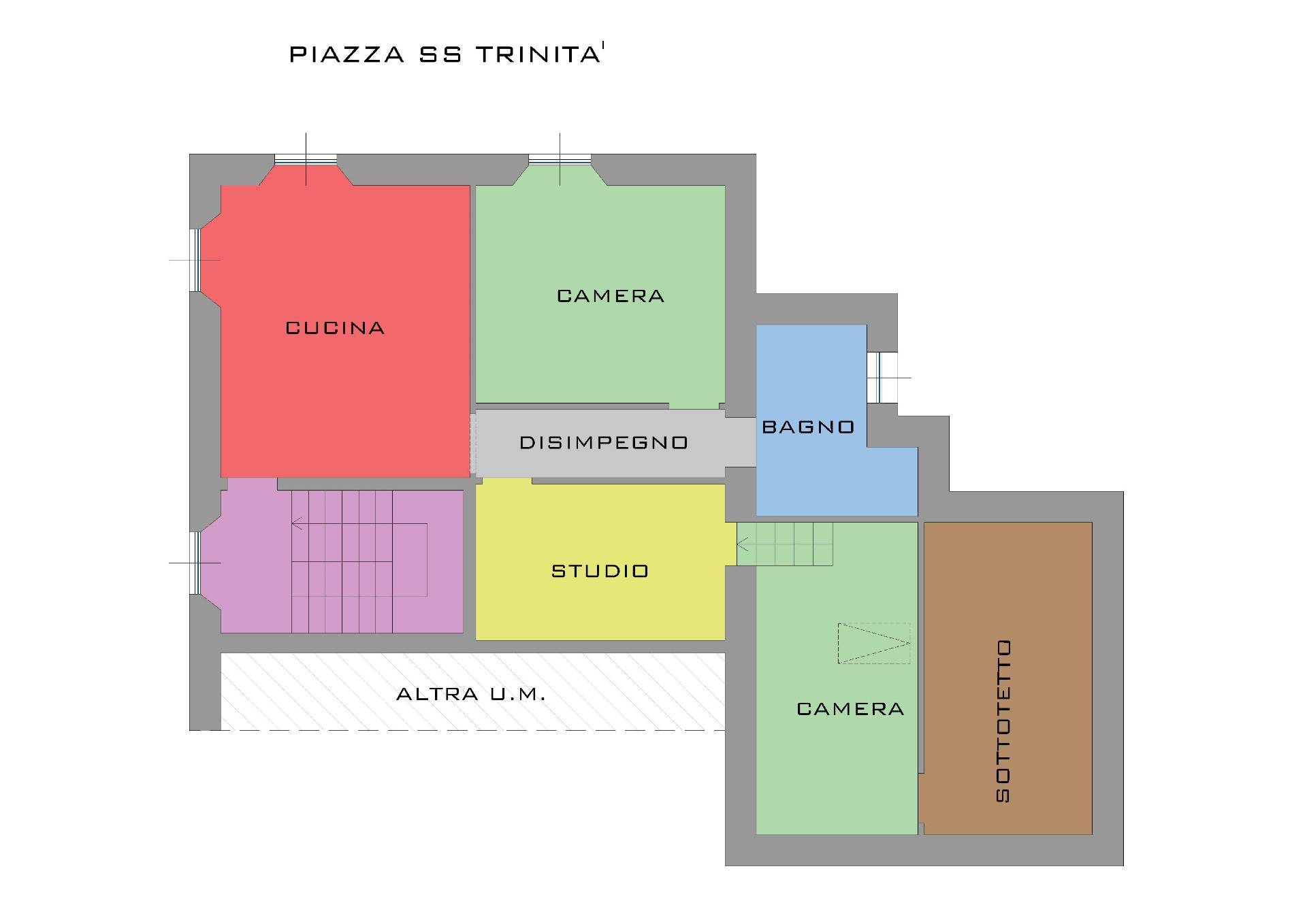 Si compone di ingresso in zona soggiorno con cucina a vista, due camere, bagno, oltre a cameretta e ripostiglio mansardati