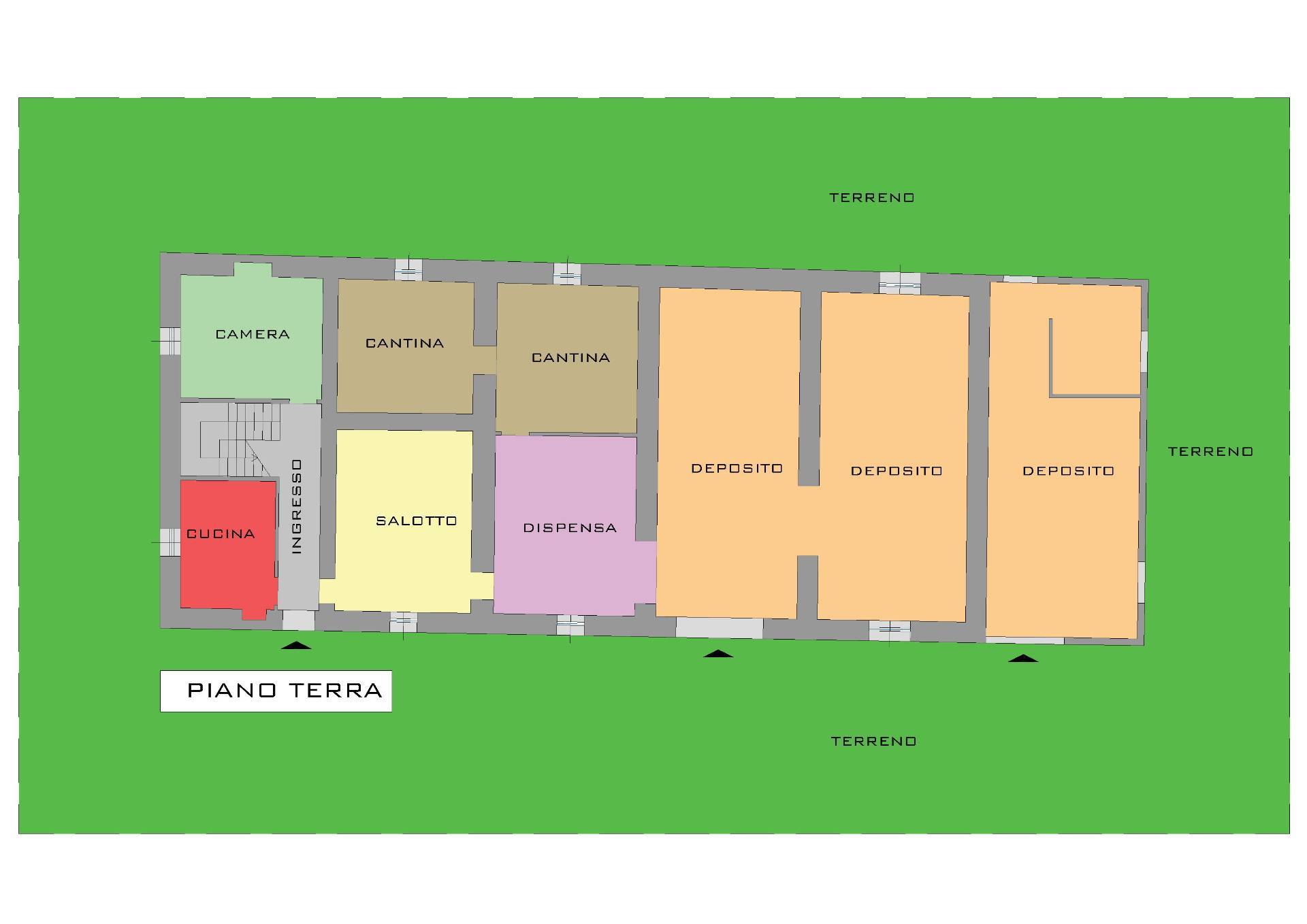 La parte residenziale presenta al piano terra: ingresso, cucina, sala, due locali di sgombero e due cantine.