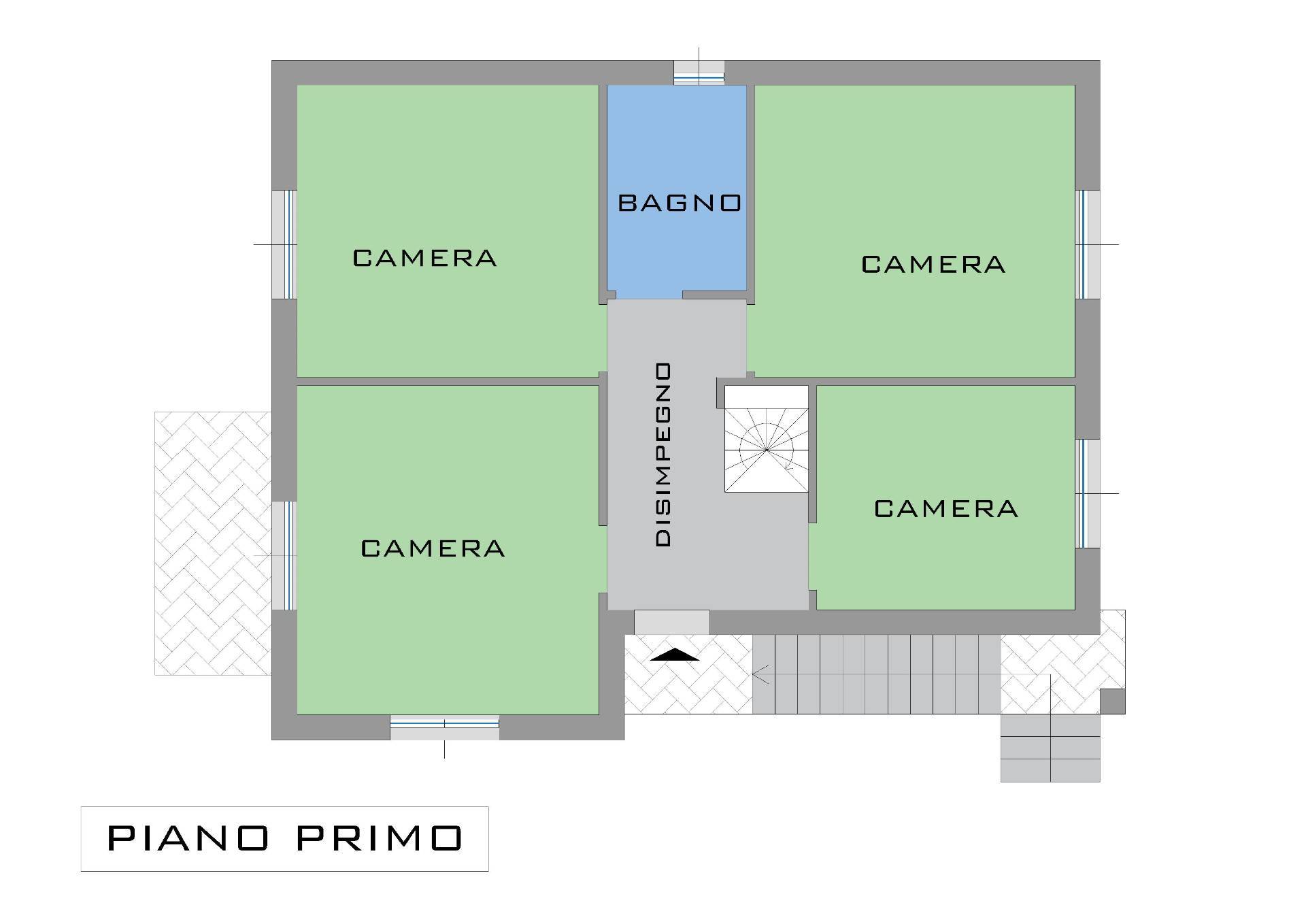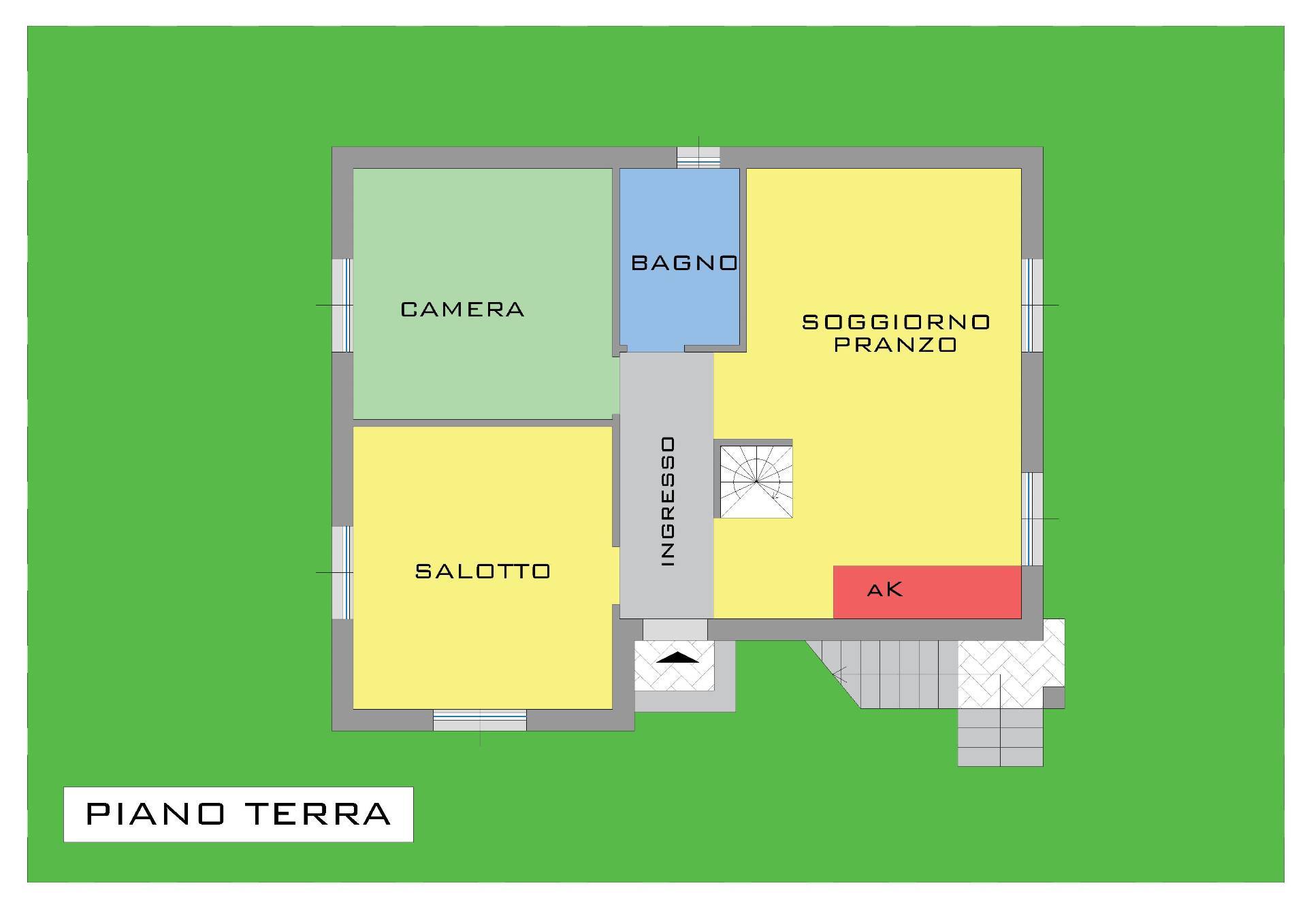 Piano terra: ingresso, ampia cucina con zona pranzo, salotto, due camere e bagno con vasca.