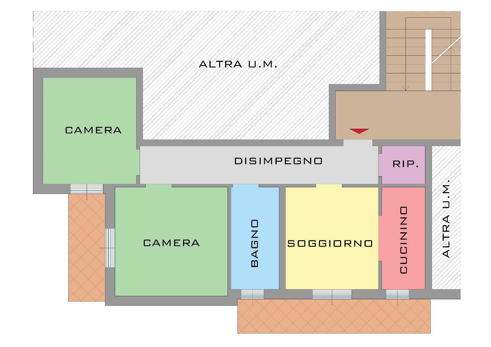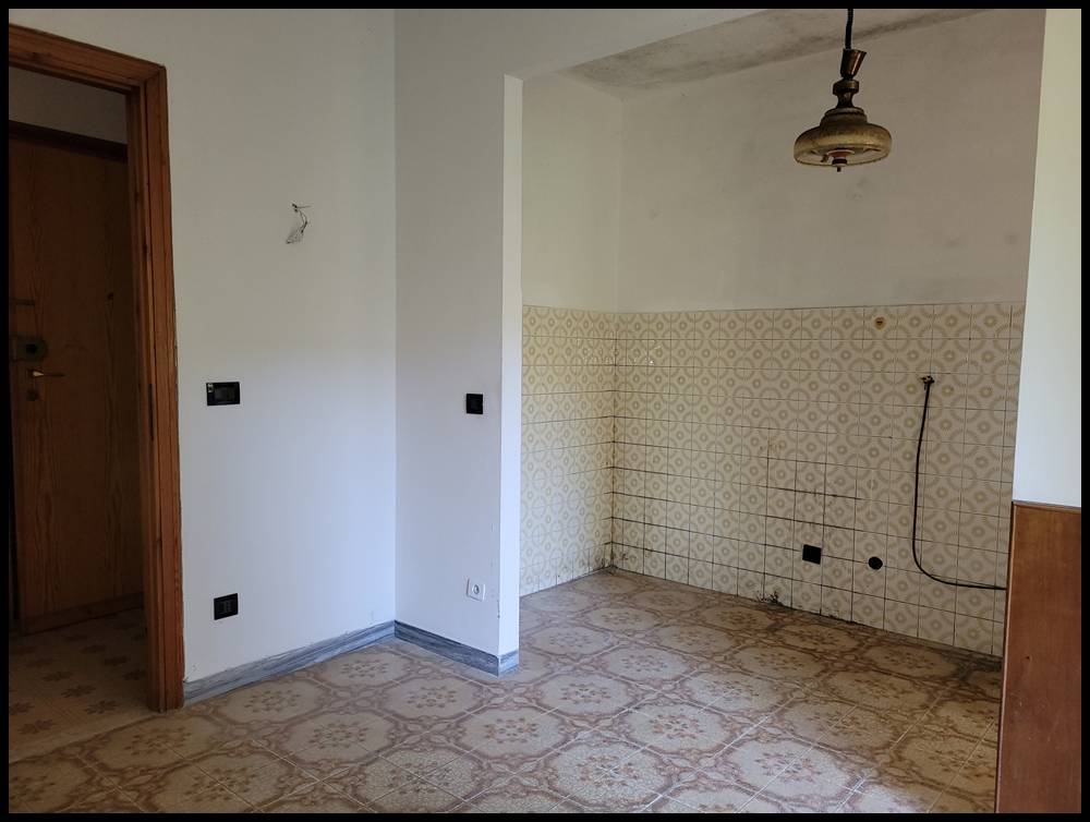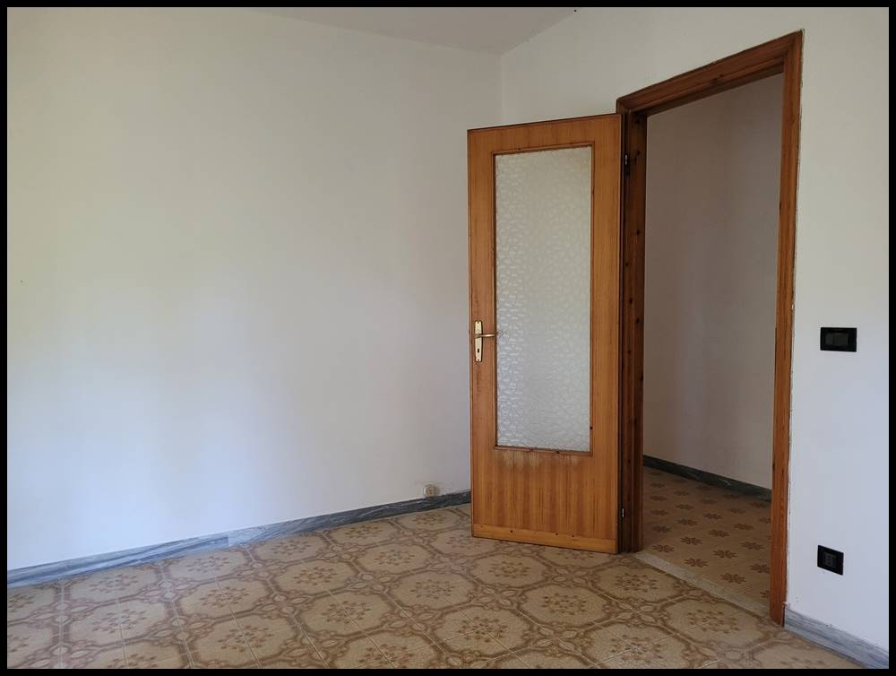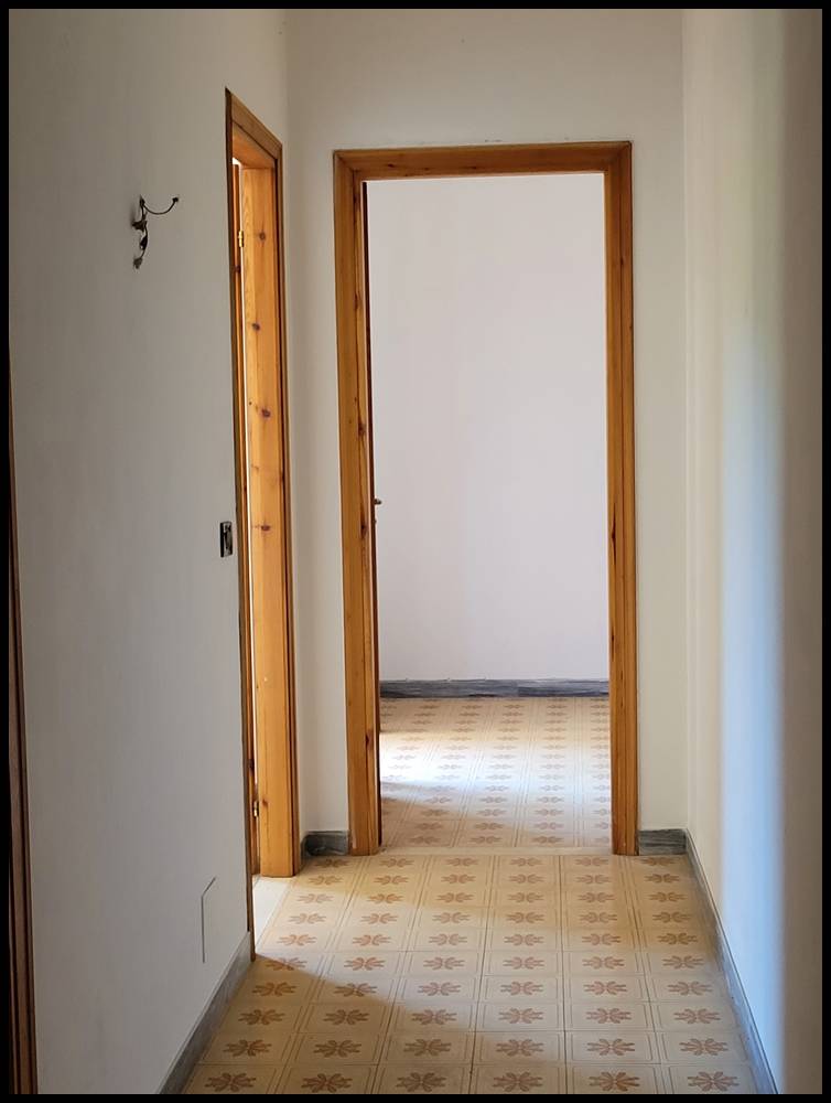 L'alloggio, posto al terzo piano, si compone di ingresso a corridoio, cucinotta e soggiorno, due camere, bagno e dispensa.