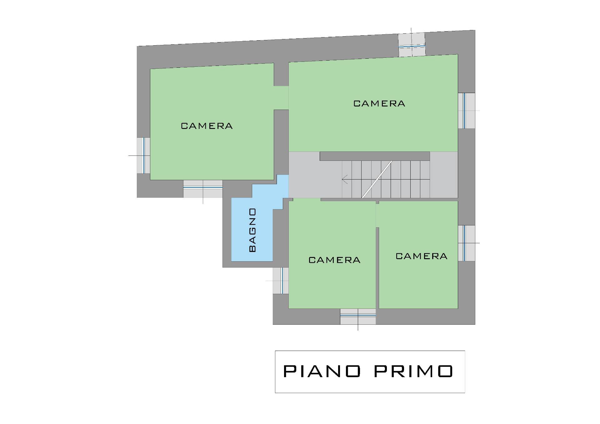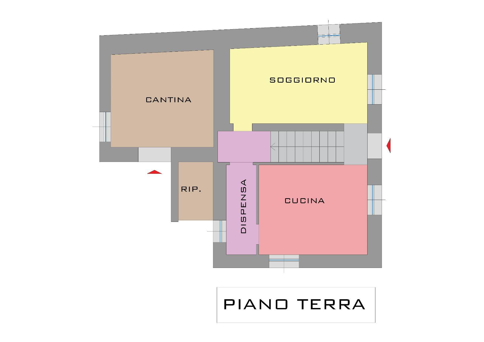 Al piano terra troviamo una cantina e un ripostiglio con accesso dall'esterno. Ingresso con scala centrale che porta al primo piano, cucina, salotto e ripostiglio.