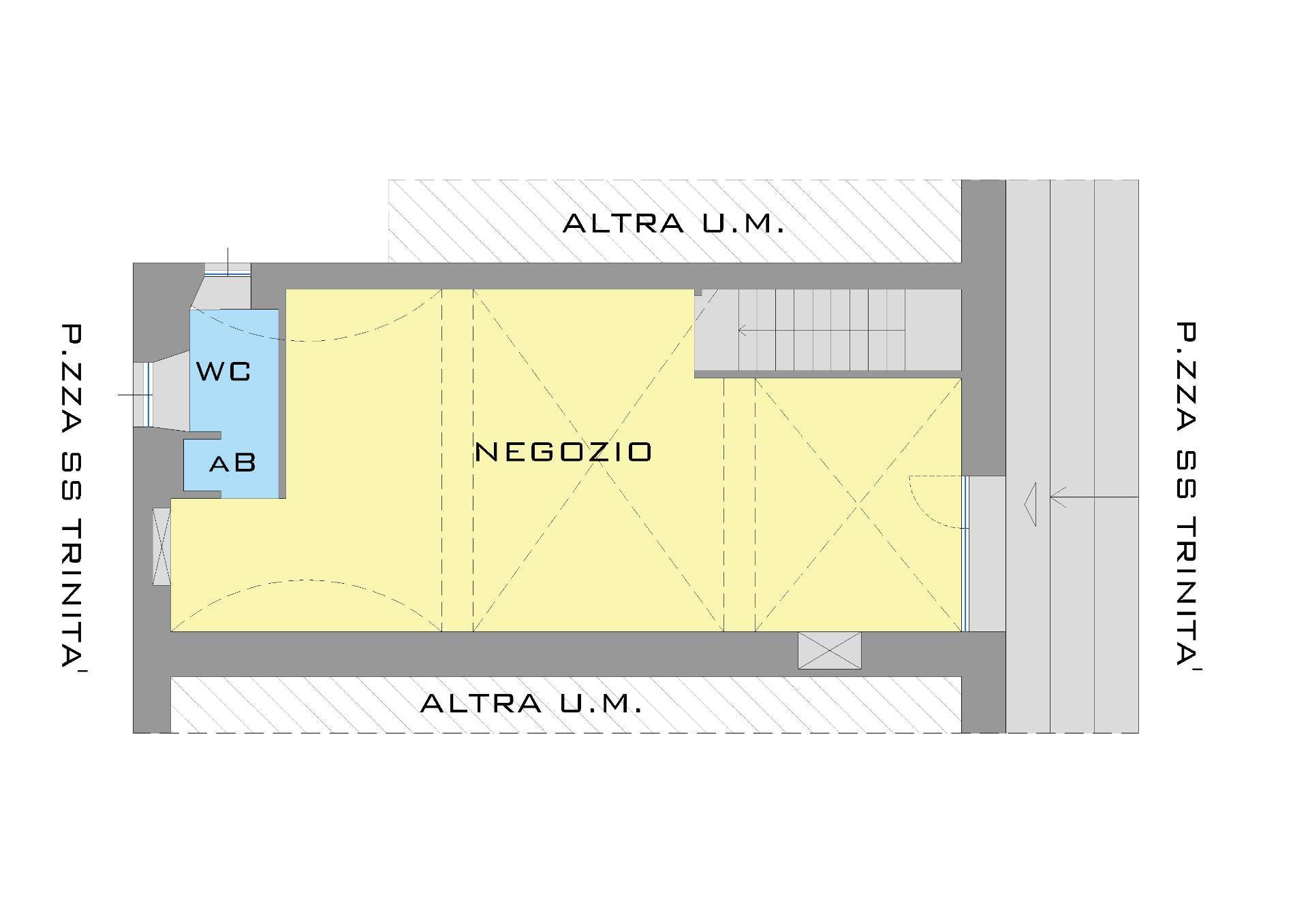 La vetrina e l'ingresso sono fronte piazza e la finestra del servizio igienico dotato di antibagno, sul vicolo secondario.