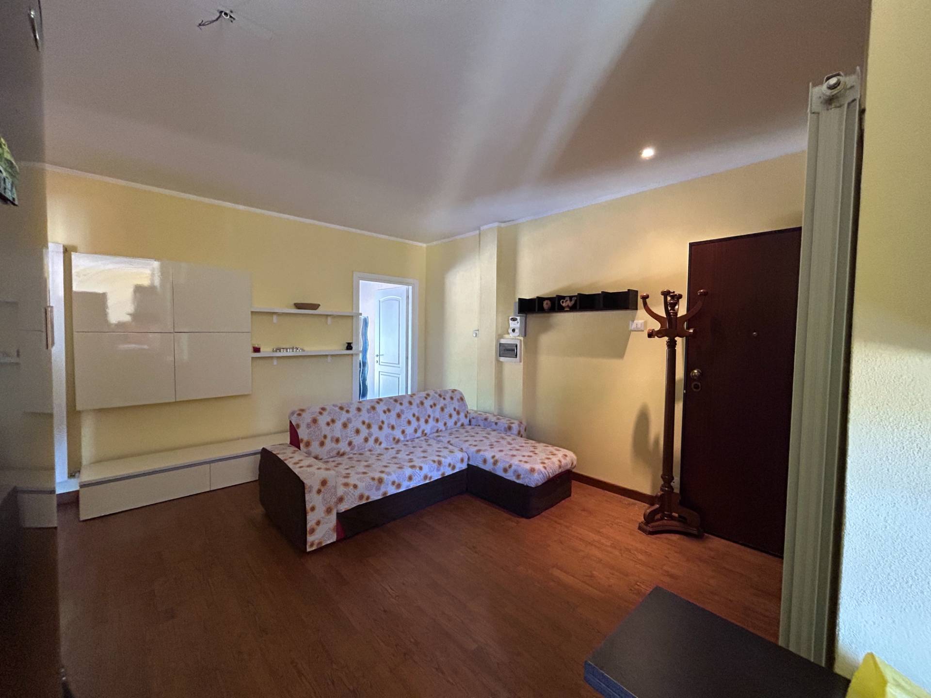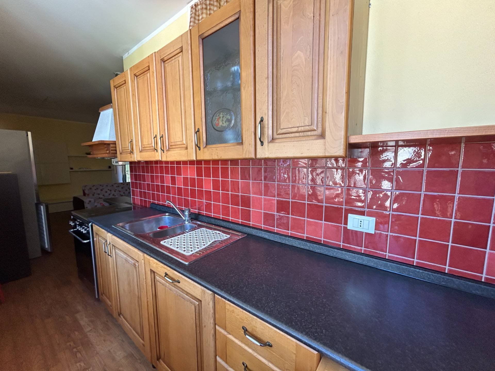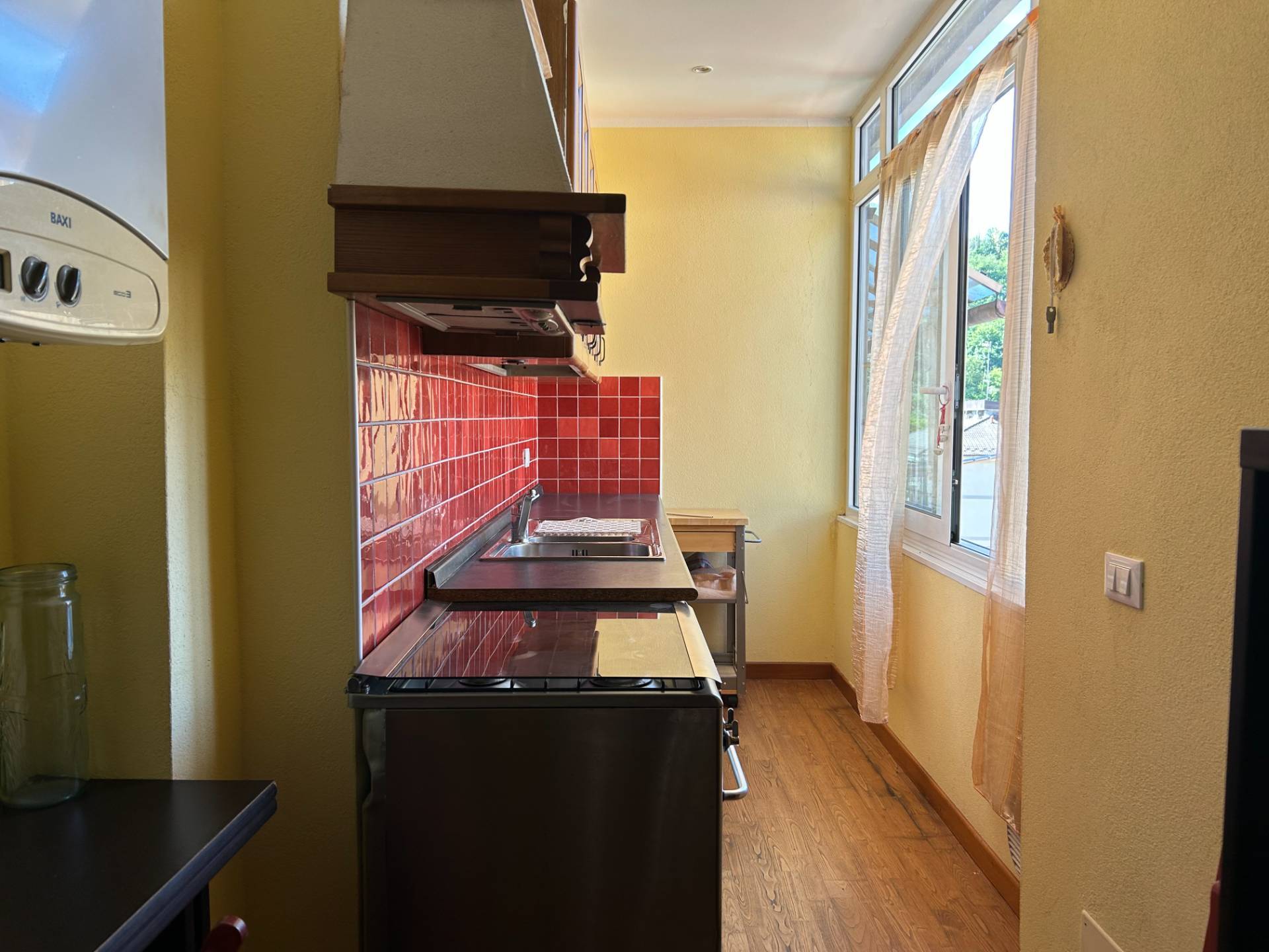 L’ingresso si apre su una zona living accogliente, dove una piccola cucina a vista si integra perfettamente con il soggiorno, creando un ambiente conviviale, ideale per la vita quotidiana o per intrattenere gli ospiti.