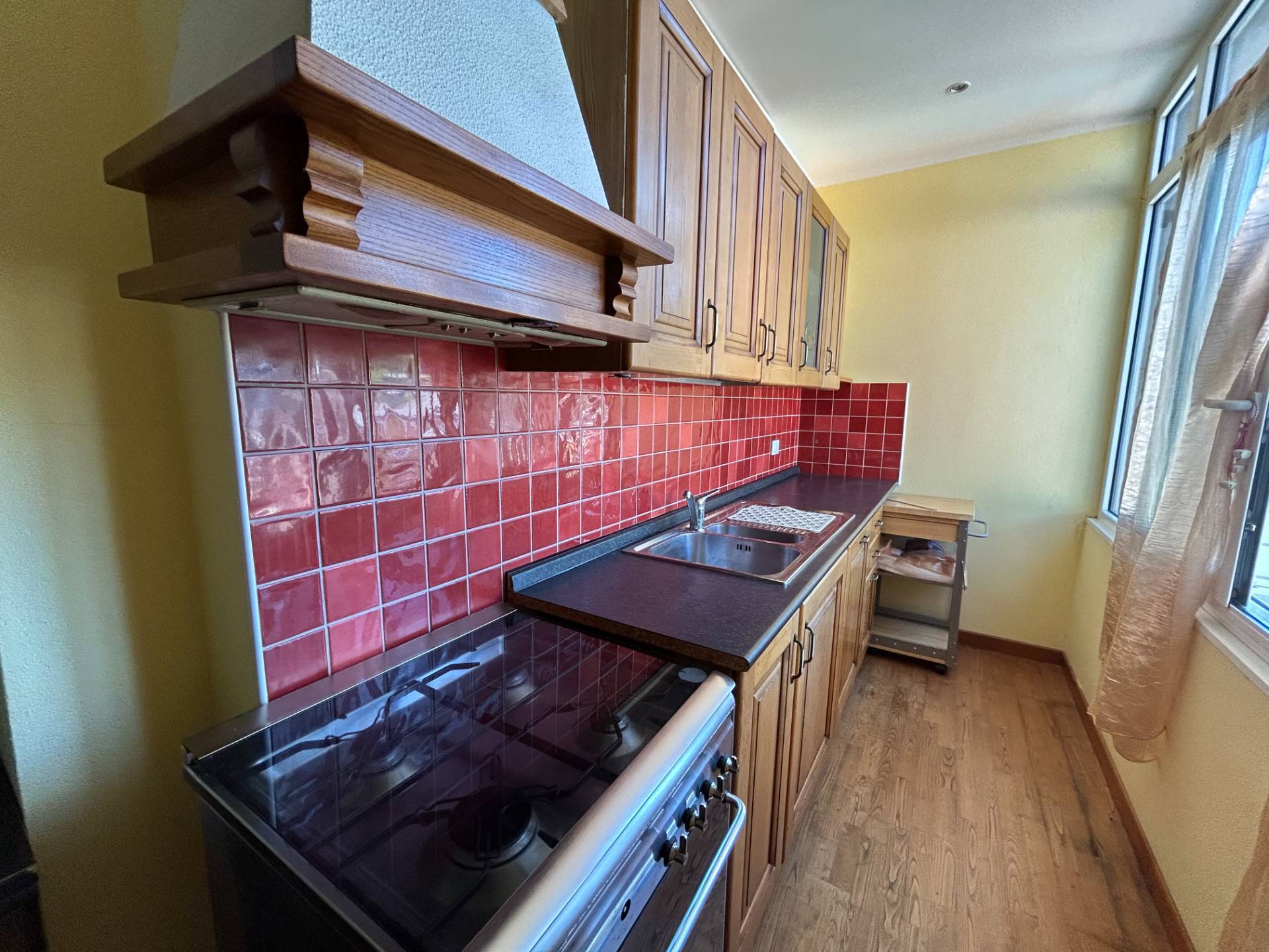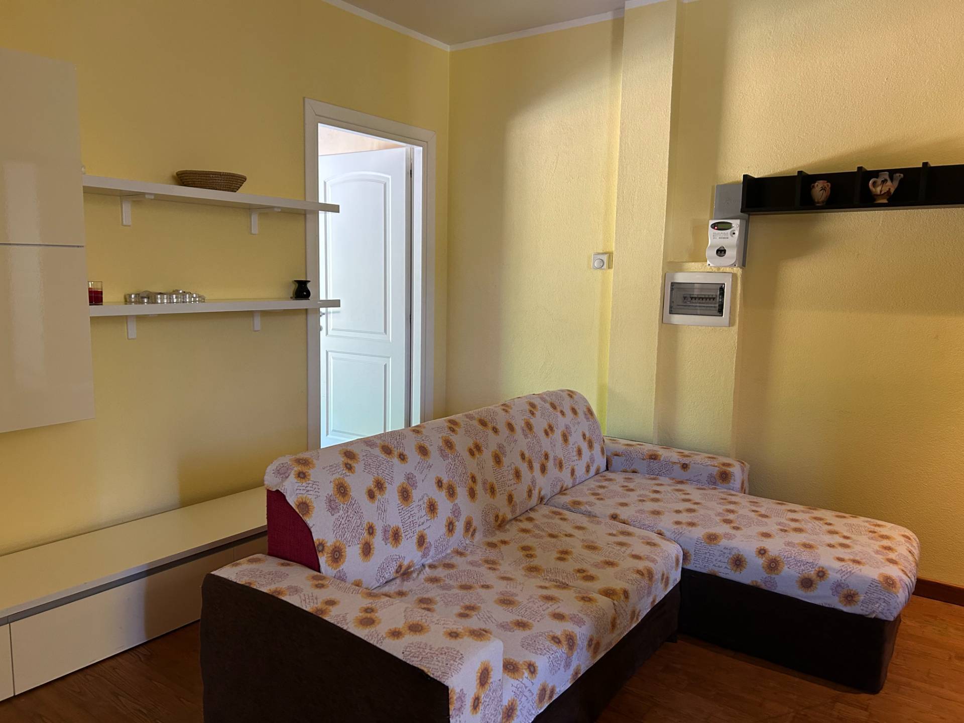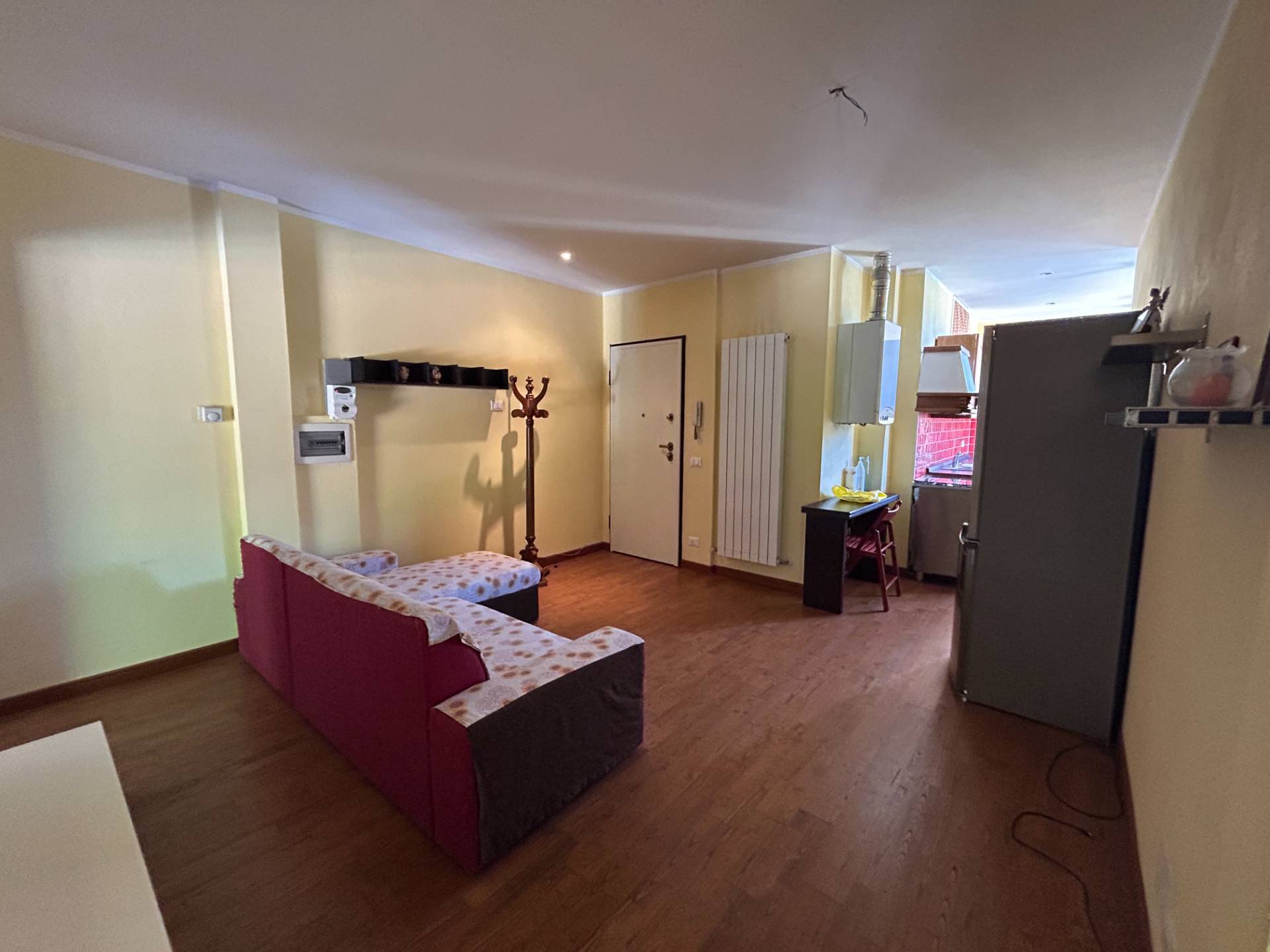 L’ingresso si apre su una zona living accogliente, dove una piccola cucina a vista si integra perfettamente con il soggiorno, creando un ambiente conviviale, ideale per la vita quotidiana o per intrattenere gli ospiti.