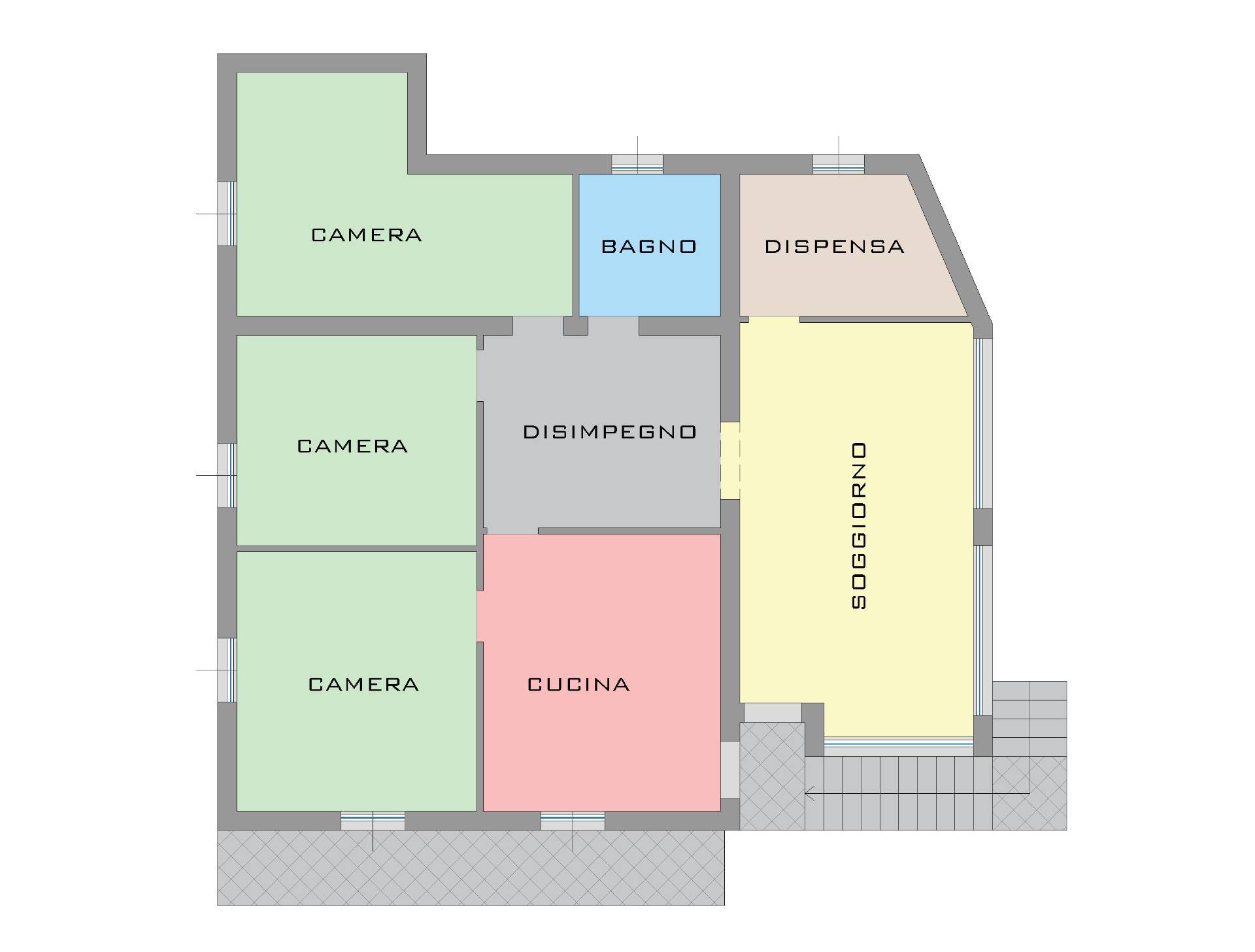 Si accede da scala esterna. Si compone di ampio soggiorno luminosissimo, disimpegno, cucina abitabile, tre camere e bagno.
