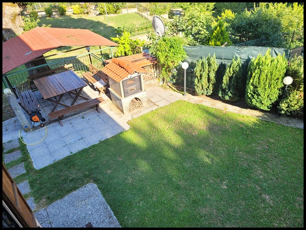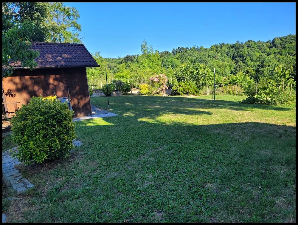 Il giardino, variamente piantumato e con numerosi alberi da frutto, ha una superficie di oltre 1700 mq e presenta vialetti interni piastrellati e un ricovero attrezzi in legno prefabbricato, pergolato e forno