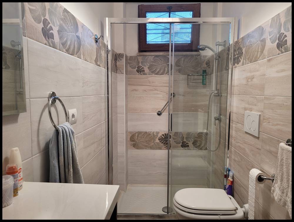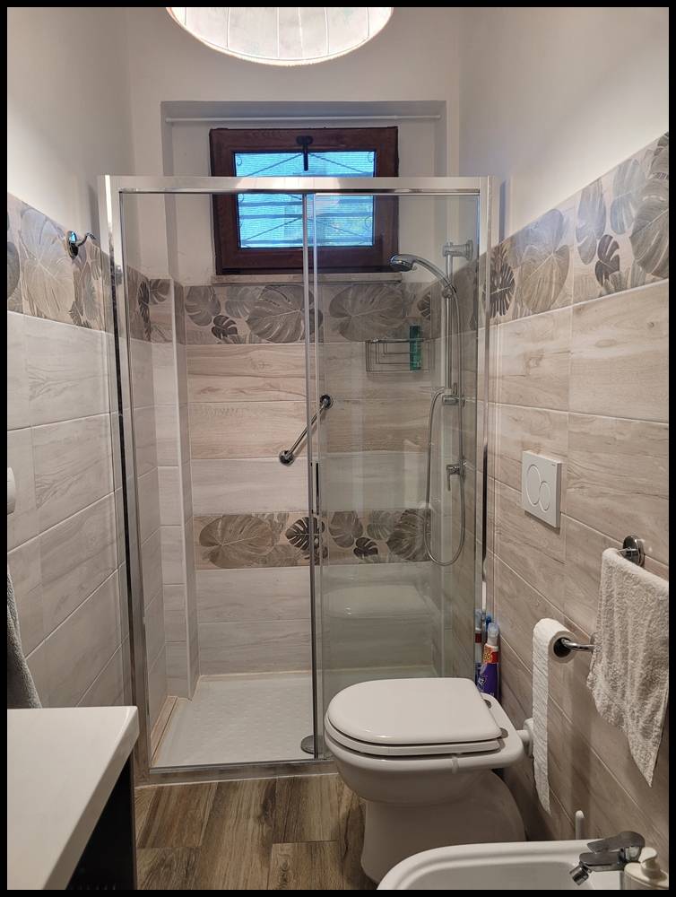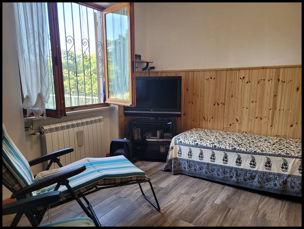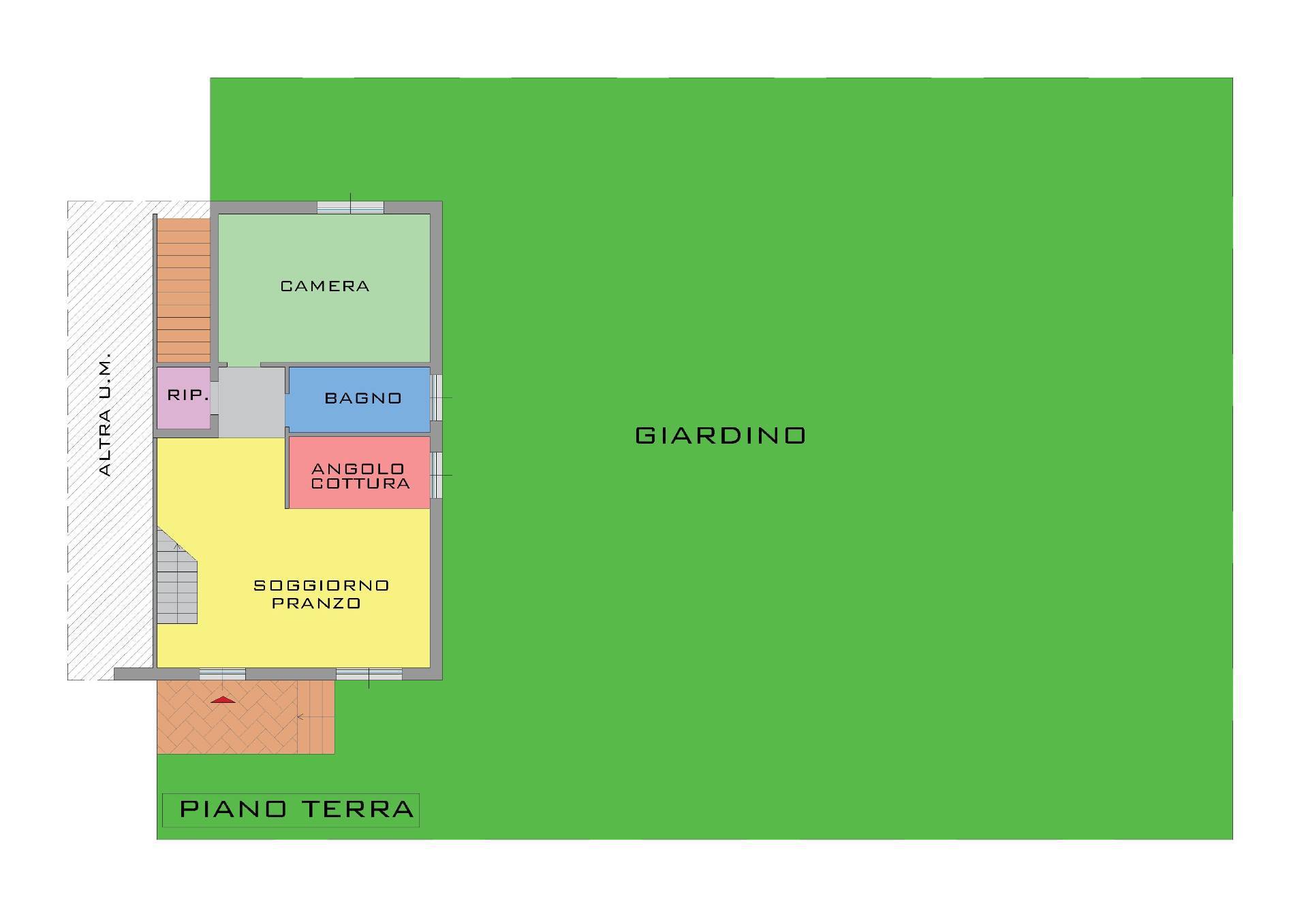 Al piano terra rialzato: ampio soggiorno con cucina a vista, camera, bagno e ripostiglio.