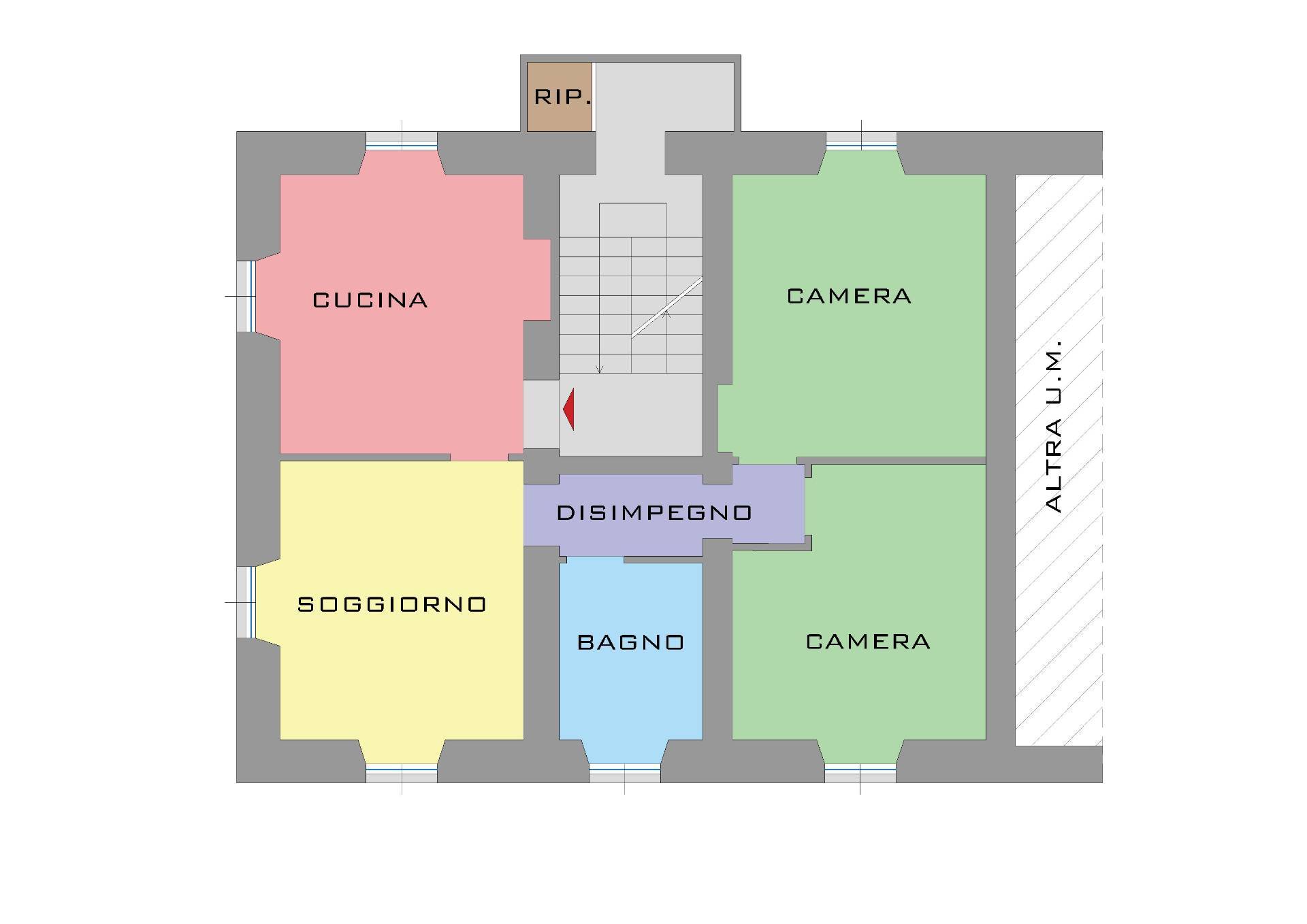 L'alloggio si trova al primo piano e si conpone di cucina abitabile, soggiorno, disimpegno, due camere e bagno.