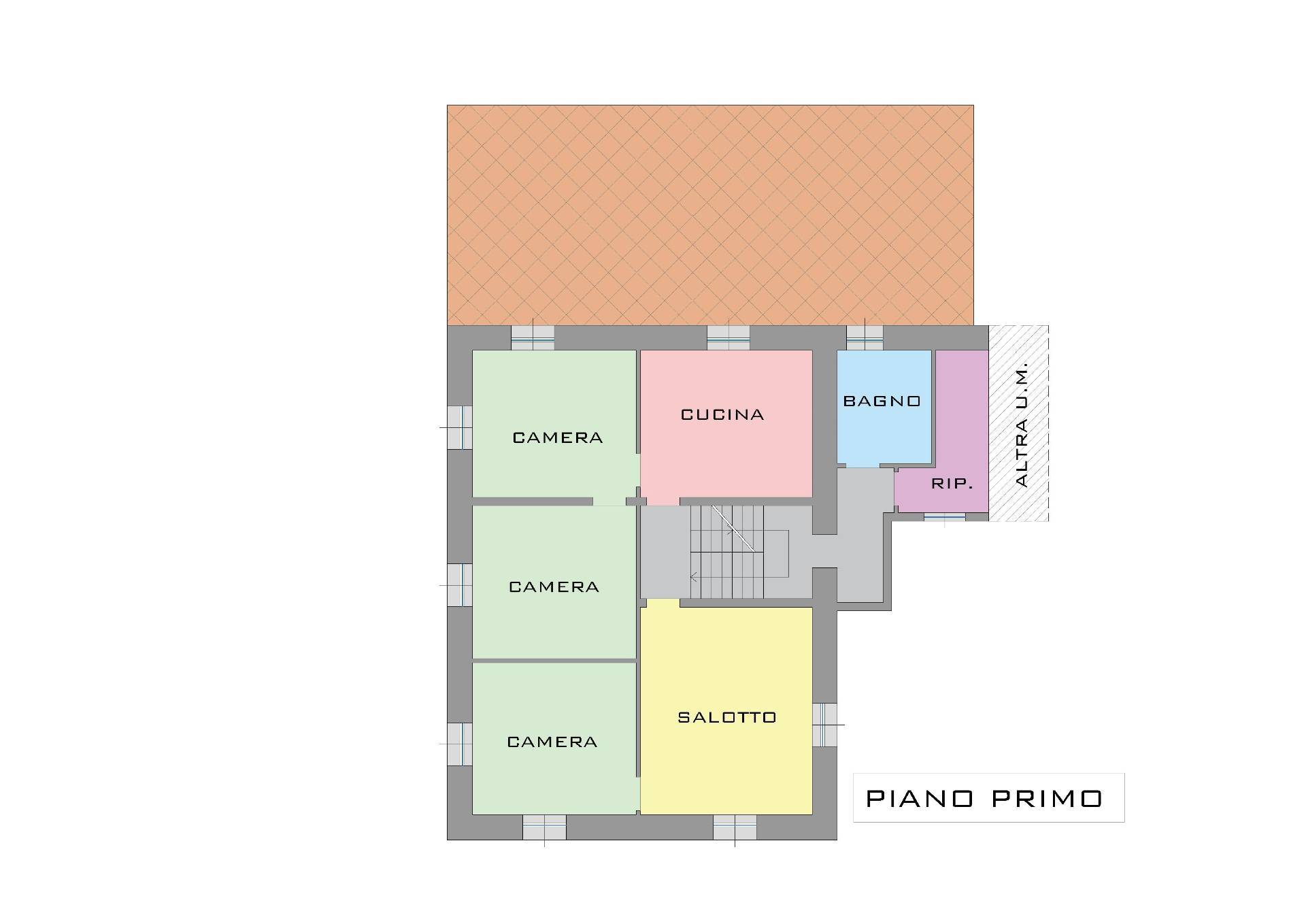 Al primo piano un appartamento che si compone di: cucina abitabile prospettante su terrazza panoramica, ampio soggiorno, tre camere, bagno e ripostiglio.