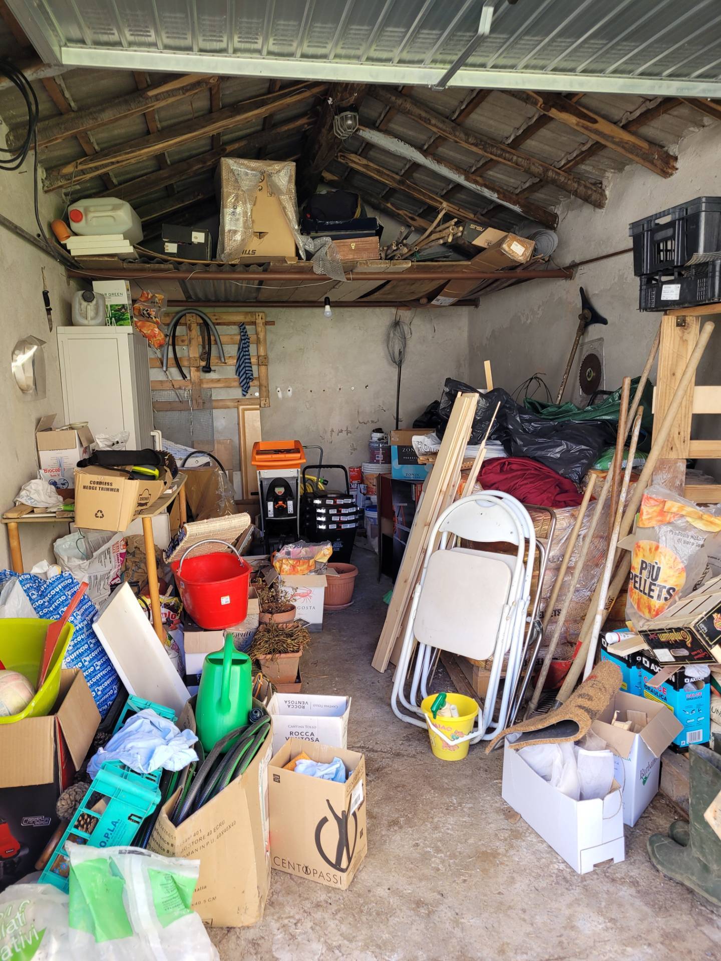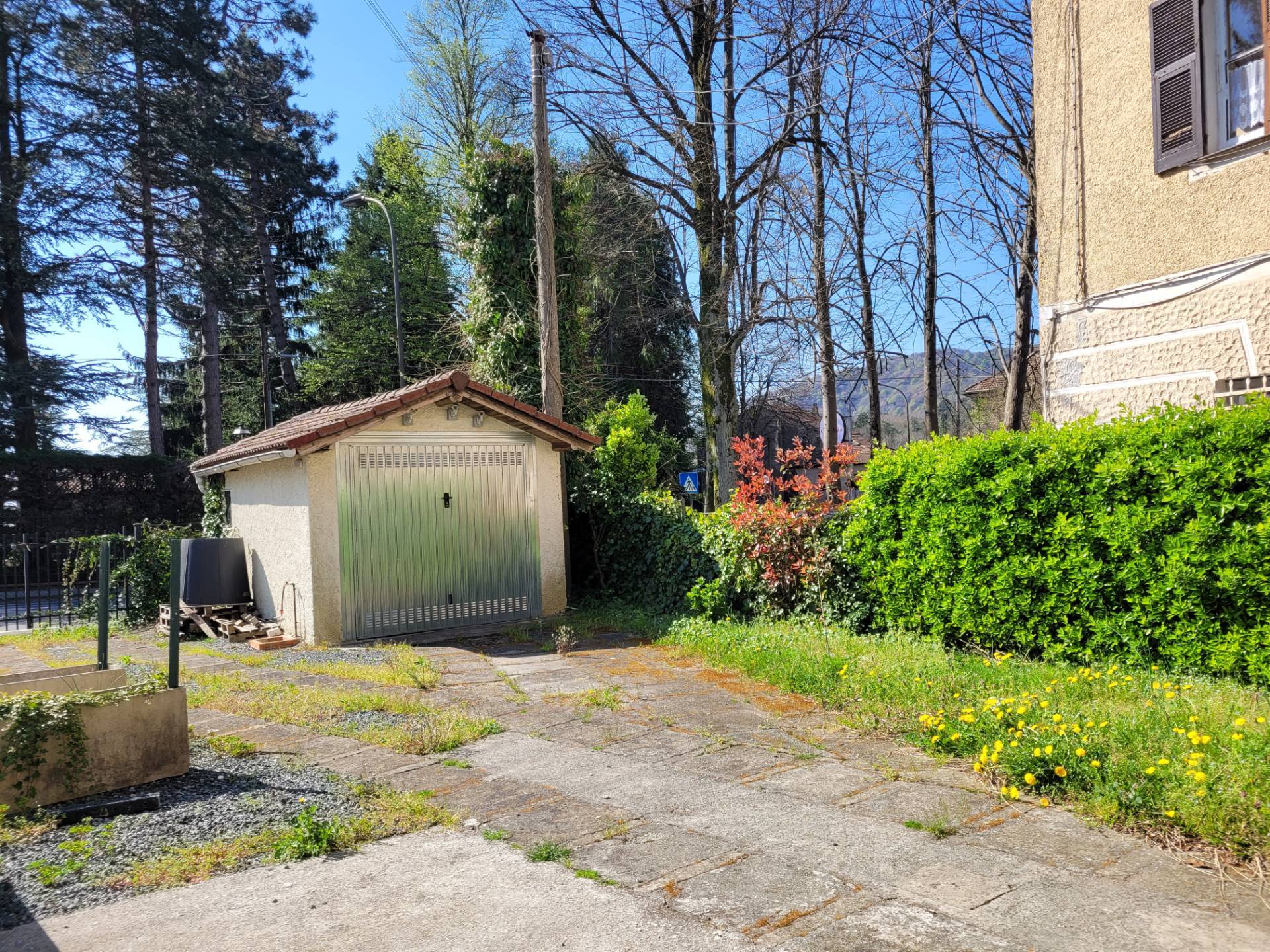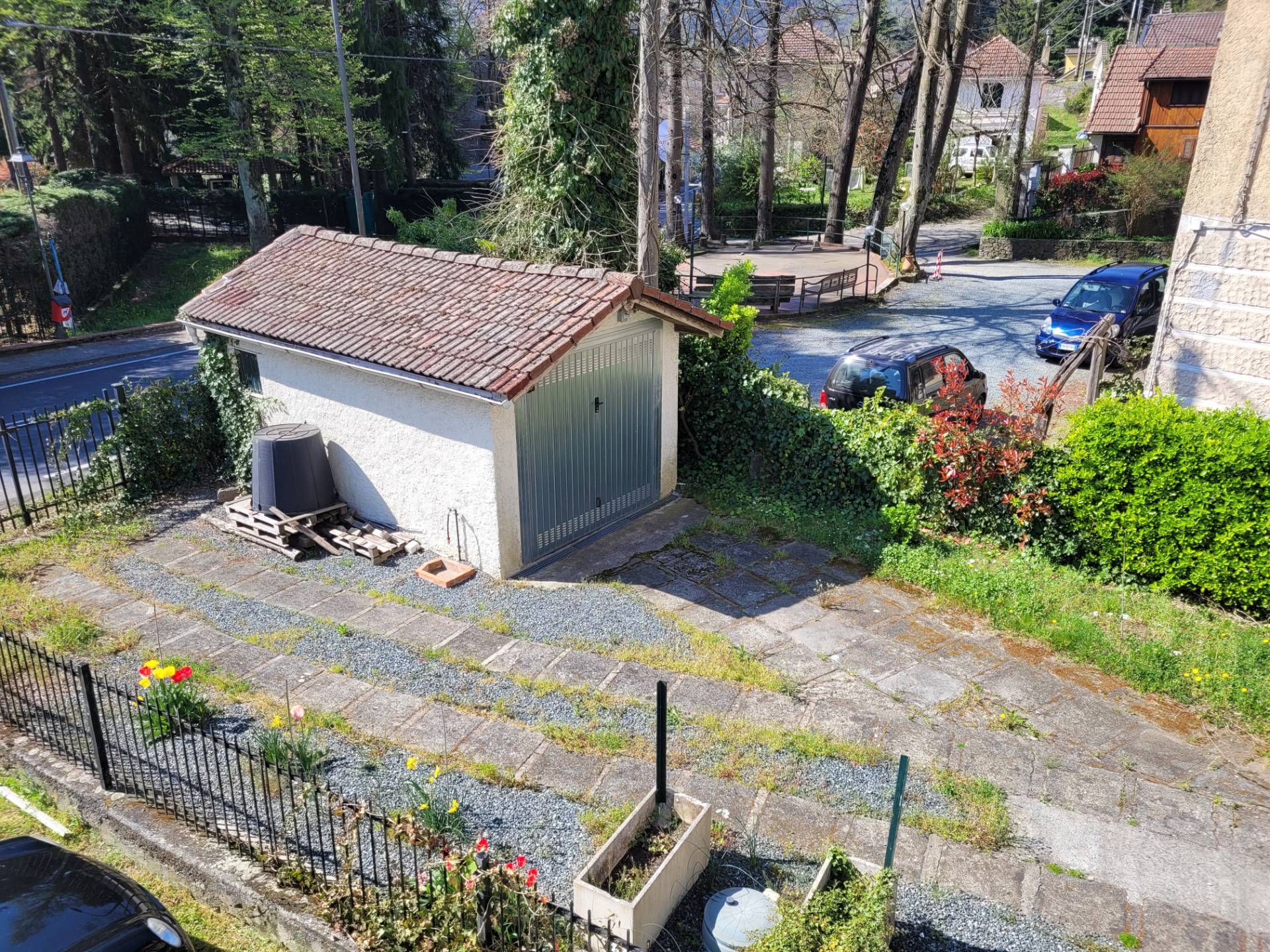 Nel giardino una costruzione che ospita il box auto.
