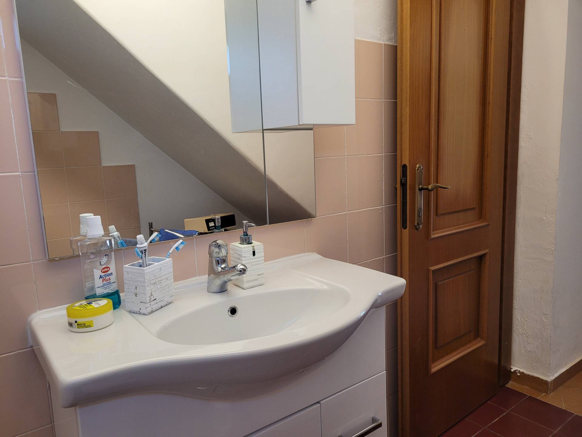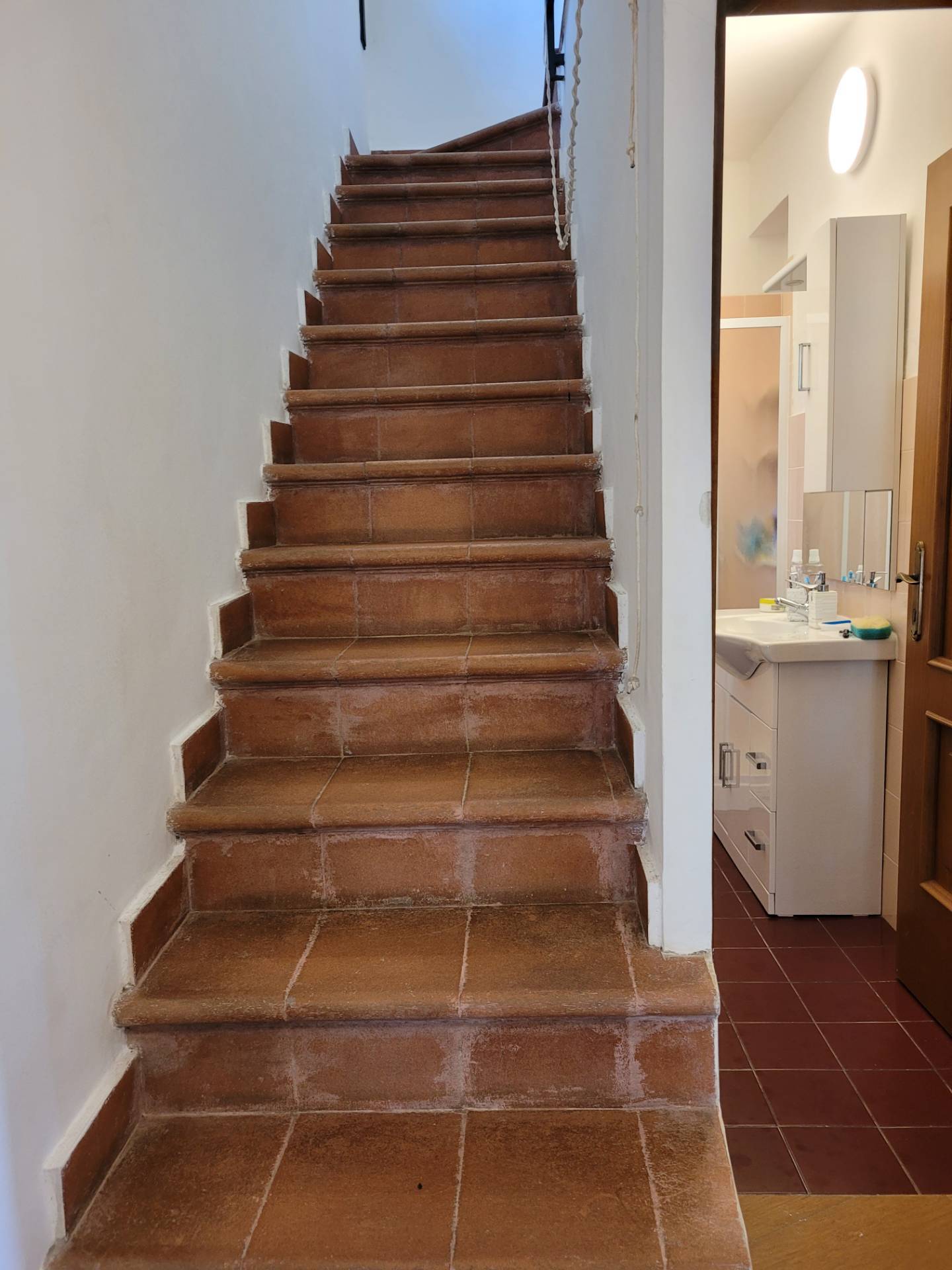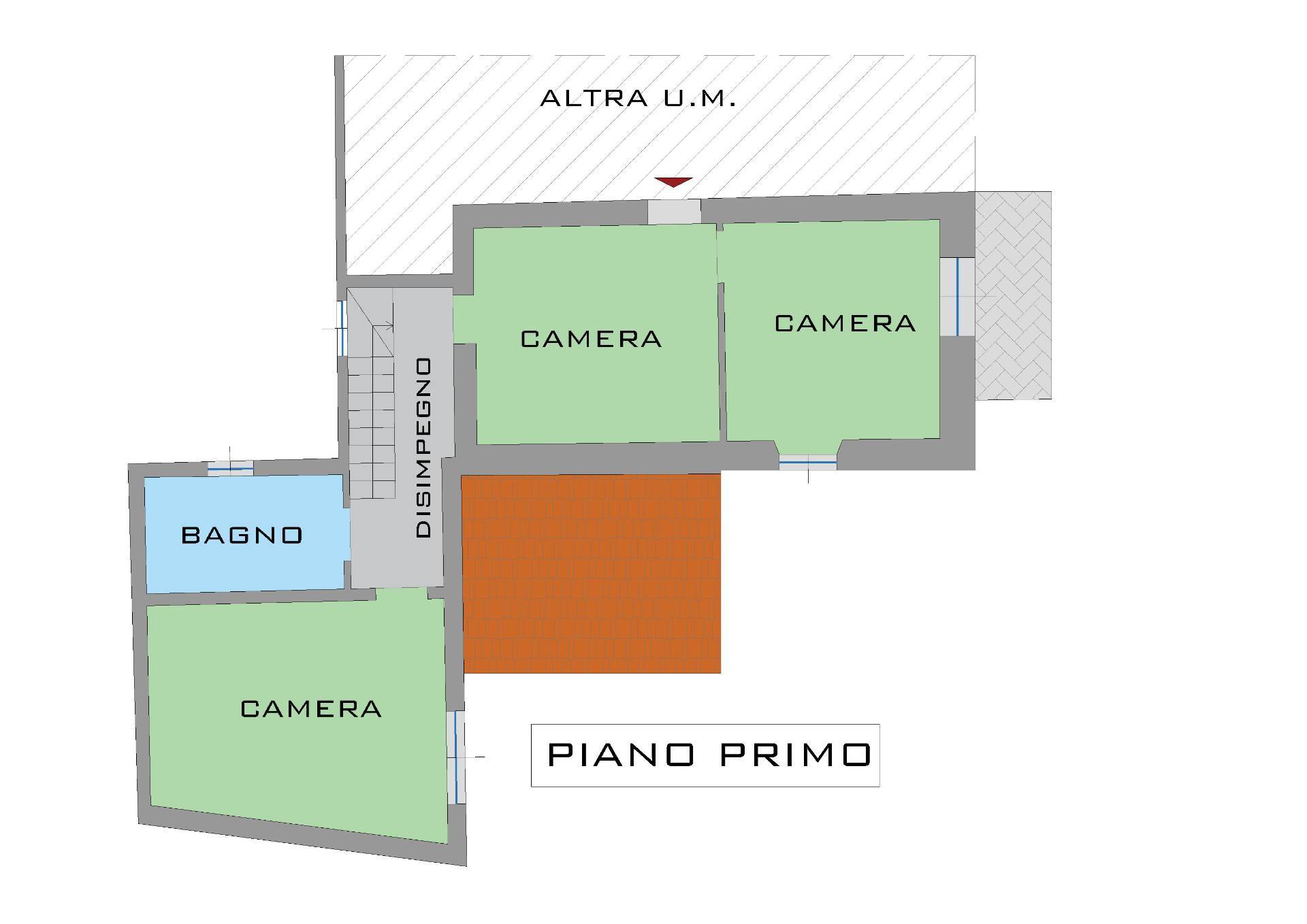Da scala interna in cotto si passa al primo piano: disimpegno, tre camere una con balcone, e bagno con vasca e doccia.